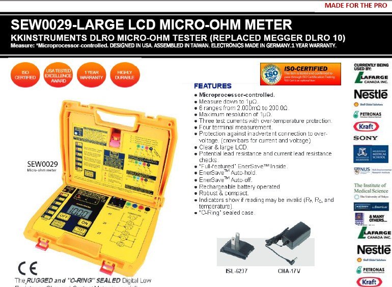 You are here: Home Products By Brands MEGGER-UK Milli-Ohm meter/Micro-Ohm meters SEW0029-KKINSTRUMENTS DLRO MICRO-OHM TESTER (REPLACED MEGGER DLRO 10)