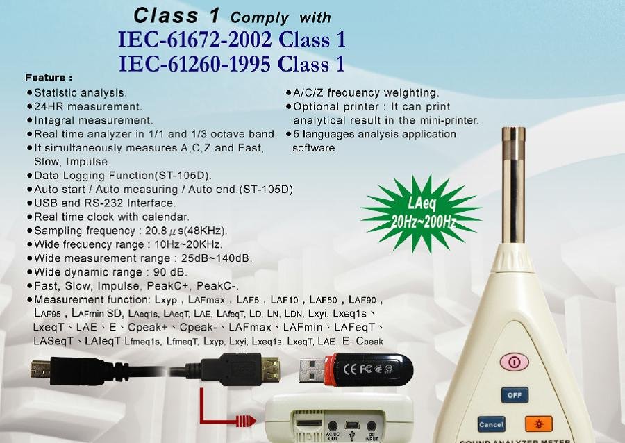 - Measurement function: Lxyp, (Lxyi), Lxeq,1s, Lxeq, T, LAE, E,Cpeak+, Cpeak- , LAFmax, LAFmin, LAFeqT, LASeqT, LAIeqT, Laeq(20Hz~200Hz).